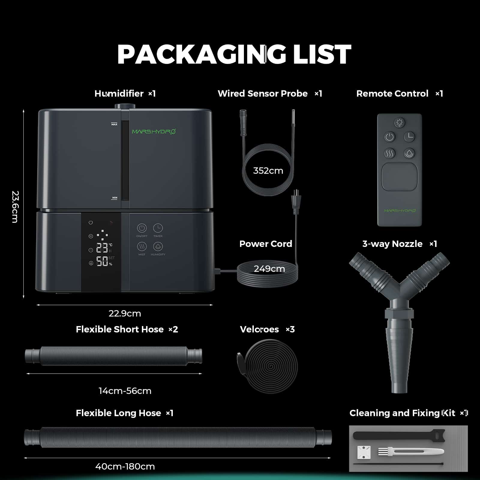Produkten innehåller: 5L luftfuktare x1, fjärrkontroll x1, kabelansluten sensor x1, flexibel kort slang x2, flexibel lång slang x1, kardborreband x3, 3-vägs munstycke x1, verktygssats x1