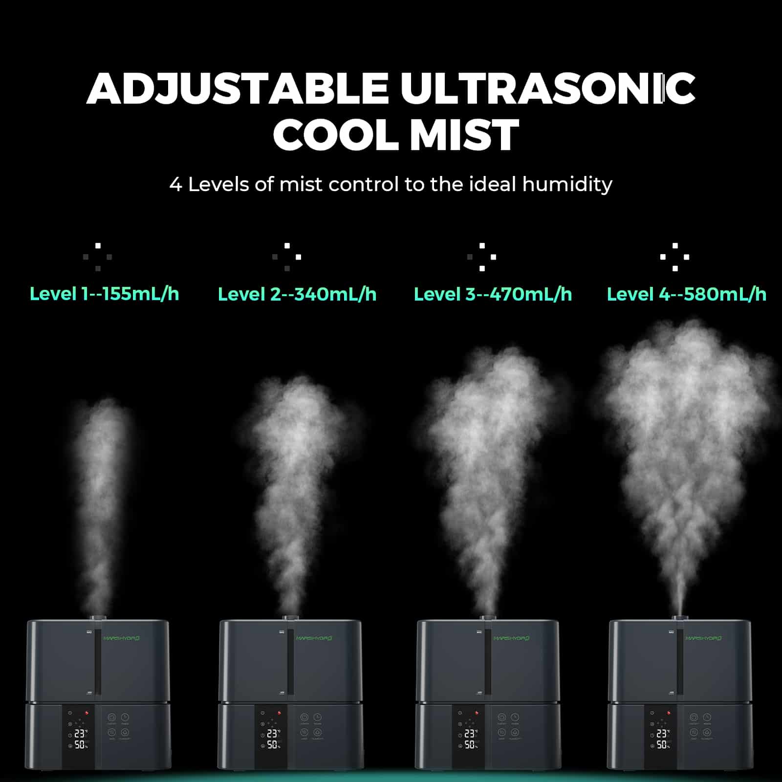 digital hygrostat som gör det möjligt att ställa in önskad luftfuktighet. Enheten reglerar automatiskt dimproduktionen för att bibehålla den valda nivån, vilket ger ett stabilt klimat utan ständig manuell justering.
