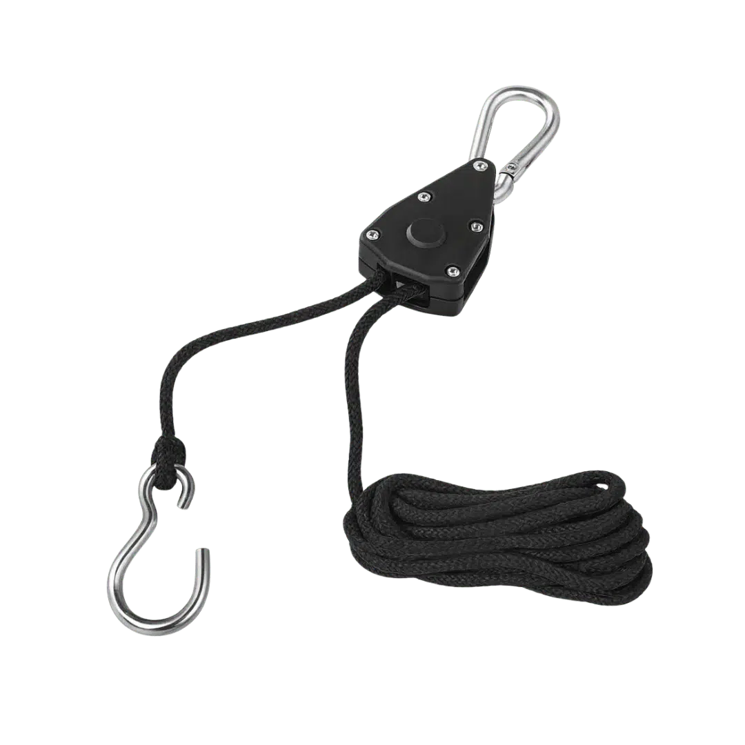 Kort sagt: En stark och användarvänlig rope ratchet med praktisk metallkrok i botten och karbinhake i toppen – en enkel men mycket effektiv lösning för säkert upphäng av din growutrustning.