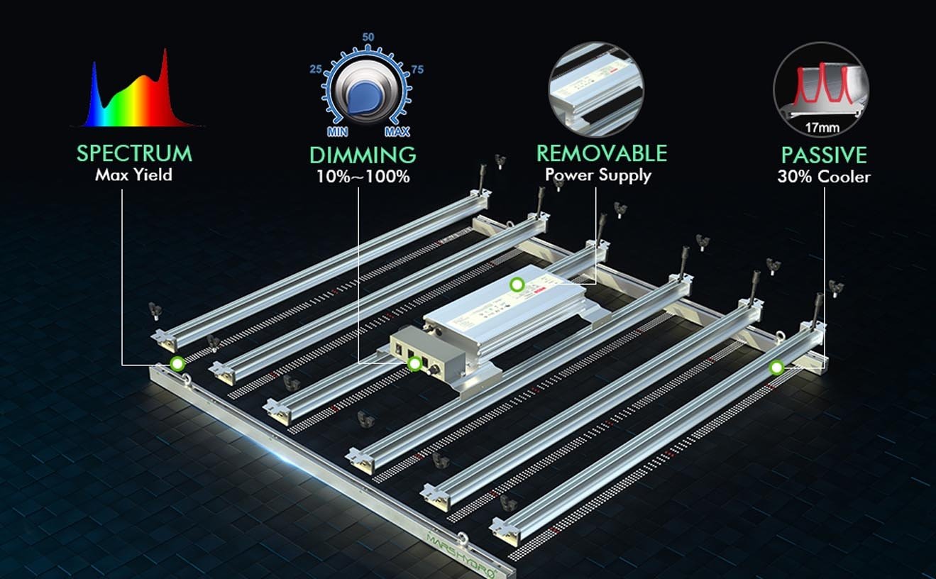 Enhetlig PAR-distribution och högt PPFD-uttag: Flerljusribbandesign och tät fördelning av ljuschips. Tillåter LED-växtlamporna att ha PPFD-värden i området 1000-1500 μmol/m²/s i hela det effektiva täckområdet.