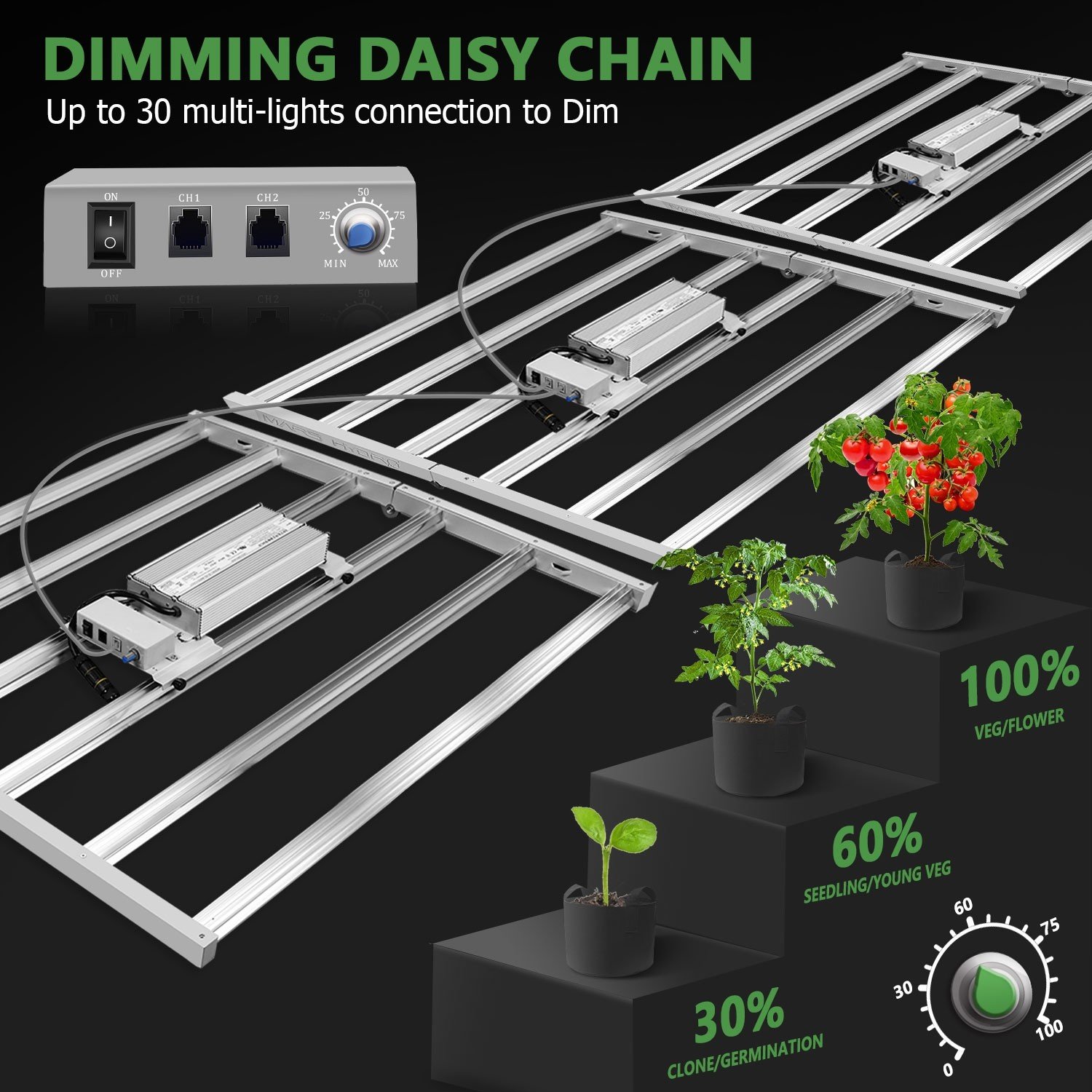 Daisy-chain dimfunktion: Dimfunktion finns tillgänglig för ljusstyrka från 10 % till 100 %, vilket tillåter olika stadier av växttillväxt och sparar elektricitet. Upp till 30 ljus kan kedjekopplas ihop och styras av en moder ljus.