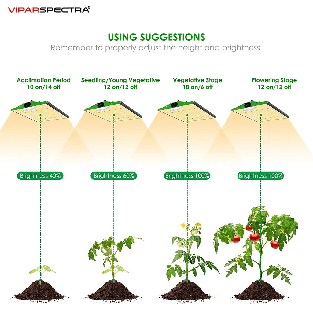 Det dimbara P1000 LED-odlingsljuset är perfekt för 75×75 cm vegetativ täckning vid 50 cm höjd och 60×60 cm blommande täckning vid 40 cm. Kom ihåg att justera höjden och ljusstyrkan korrekt efter din växts önskade nivå för optimal tillväxt.