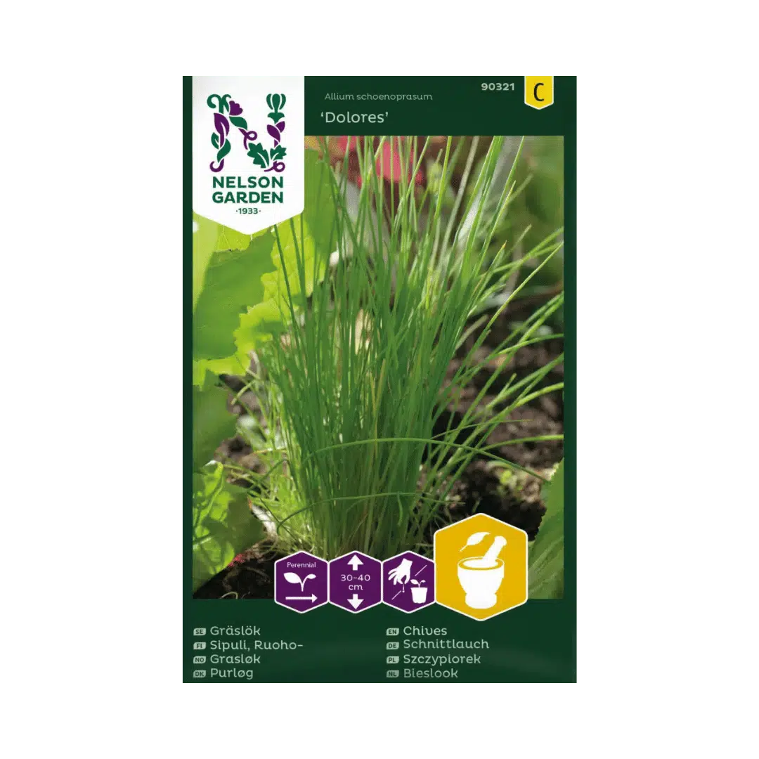 Dolores är en klassisk och lättodlad flerårig gräslök som utvecklar smala, eleganta blad med en mycket fin arom och en mild, behaglig löksmak. Sorten är särskilt väl lämpad för färsk användning i sallader, äggrätter, sill och färskpotatis, där den tillför friskhet utan att dominera. Bladen kan dessutom frysas och användas senare under året, vilket gör Dolores både praktisk och användbar i vardagen. Den trivs bäst på en solig plats och kan sås under en lång period, vilket gör den flexibel och enkel att passa in både i köksträdgården och i örtbädden. Skörden sträcker sig från sommaren och långt in på hösten.