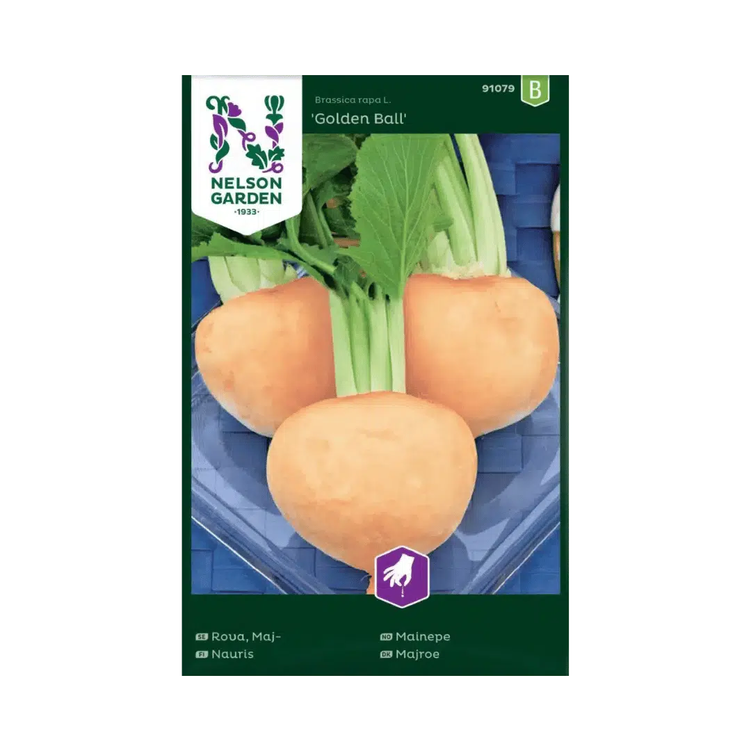 Golden Ball’ är en populär och traditionell majrova-sort, känd för sina runda, gyllene knölar och sin milda, lätt söta smak. Den är lätt att odla, växer snabbt och ger en fin skörd, vilket gör den lämpad för både nybörjare och erfarna trädgårdsodlare. Sorten kan sås från tidig vår och långt in på sommaren. Med löpande sådd kan du skörda färska majrovor ända in på hösten. Plantan trivs i de flesta jordtyper och kräver minimal skötsel – bara jämn fukt och en inte för varm växtplats.