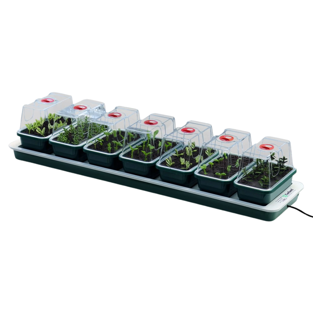Med 7 mini-ventilerade propagatorer, en idealisk storlek för de flesta trädgårdsmästare, tillåter Super 7 propagator användaren att odla ett stort antal växtsorter på endast en enhet. Den uppvärmda basen innehåller ett 13 Watts kolfiberelement för jämn värmefördelning. Denna enhet är inte termostatstyrd och är utformad för att öka den omgivande komposttemperaturen med cirka 8°C.